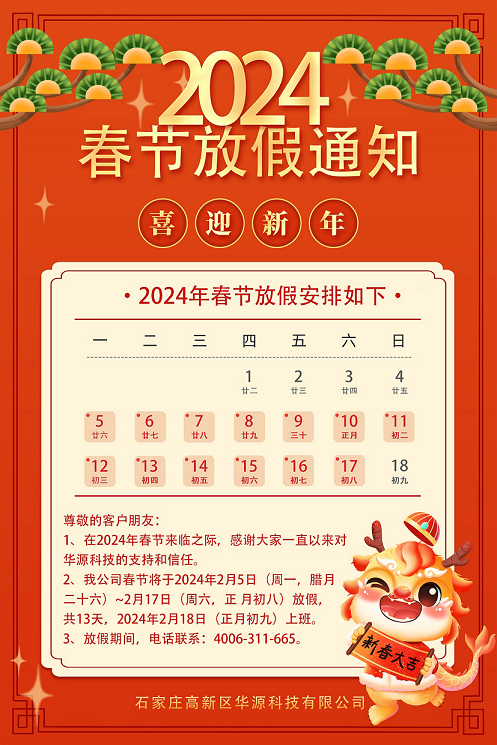 石家莊高新區(qū)華源科技春節(jié)放假通知,公司是石家莊專業(yè)的太陽能、空氣能熱泵服務商,擁有豐富的行業(yè)經(jīng)驗、專業(yè)的技術服務,熱水洗浴、制冷、采暖系統(tǒng)咨詢定制電話:4006-311-665,華源科技祝大家新年快樂,龍年吉祥!